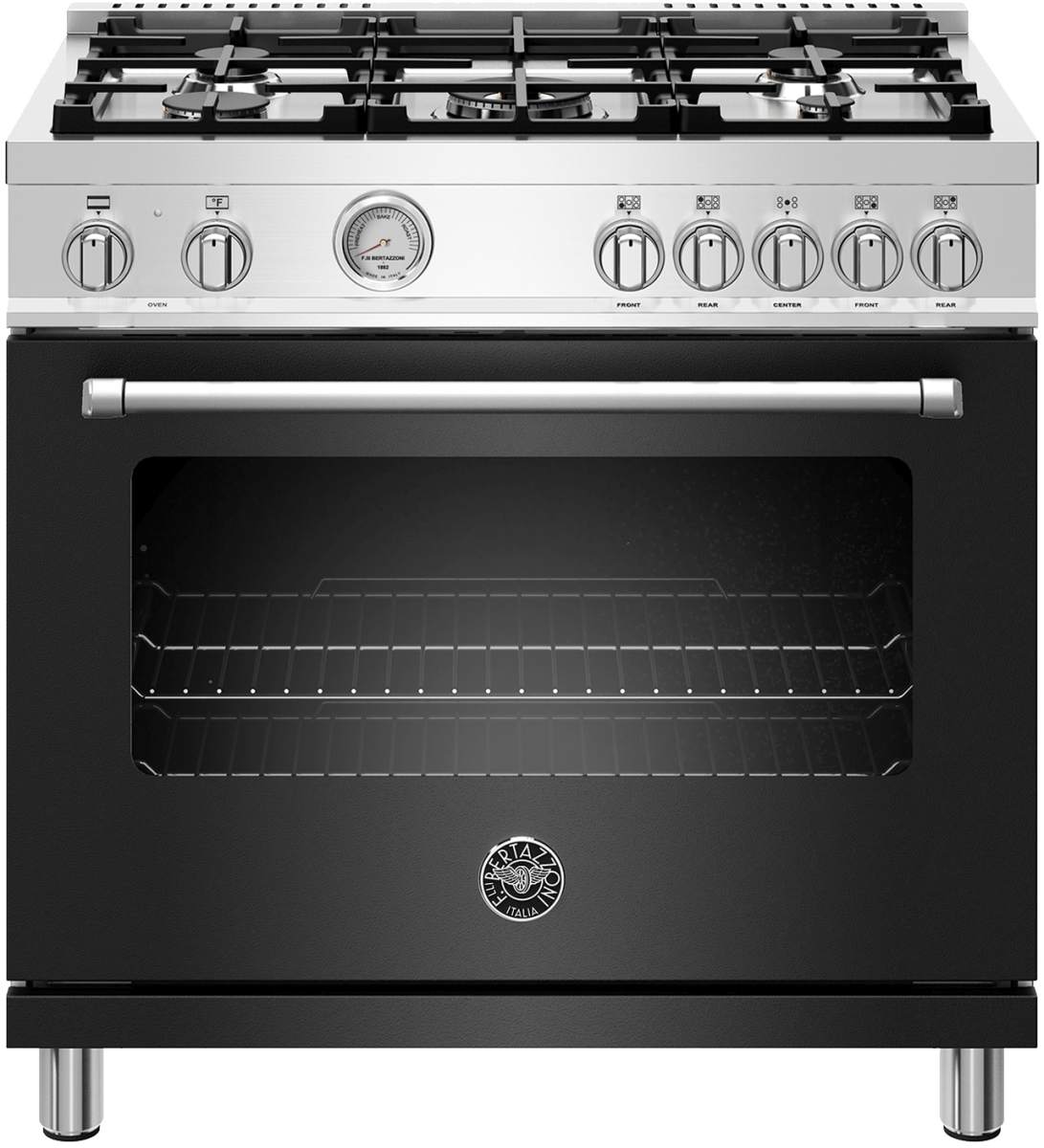 The new Bertazzoni ranges are superb cooking appliances designed, engineered and made in Italy. All Bertazzoni appliances integrate seamlessly into style-harmonized suites for a true, high-performing kitchen. The high-efficiency maintop with 5 burners features a dual ring 19,000 BTU power-burner that boil water in under 6 minutes (best in class), and 4 additional MonoBloc burners of variable size and power to suit every style of cooking, with delicate simmer at 750 BTUs. The 5.9 cubic feet oven cavity is the largest in its class, with dual convection fan for balanced airflow and even temperature baking and roasting on 7 shelf levels. The elegant large temperature gauge monitors the actual temperature in the oven. The extra wide electric broiler with optional convection is ideal for grilling and searing at high heat. The oven includes convenient soft-motion doors. The edge-to-edge interior oven glass door maximizes interior volume and can be wiped clean without effort. All Bertazzoni appliances are covered by a 2-year warranty. Products and packaging are 99% recyclable.