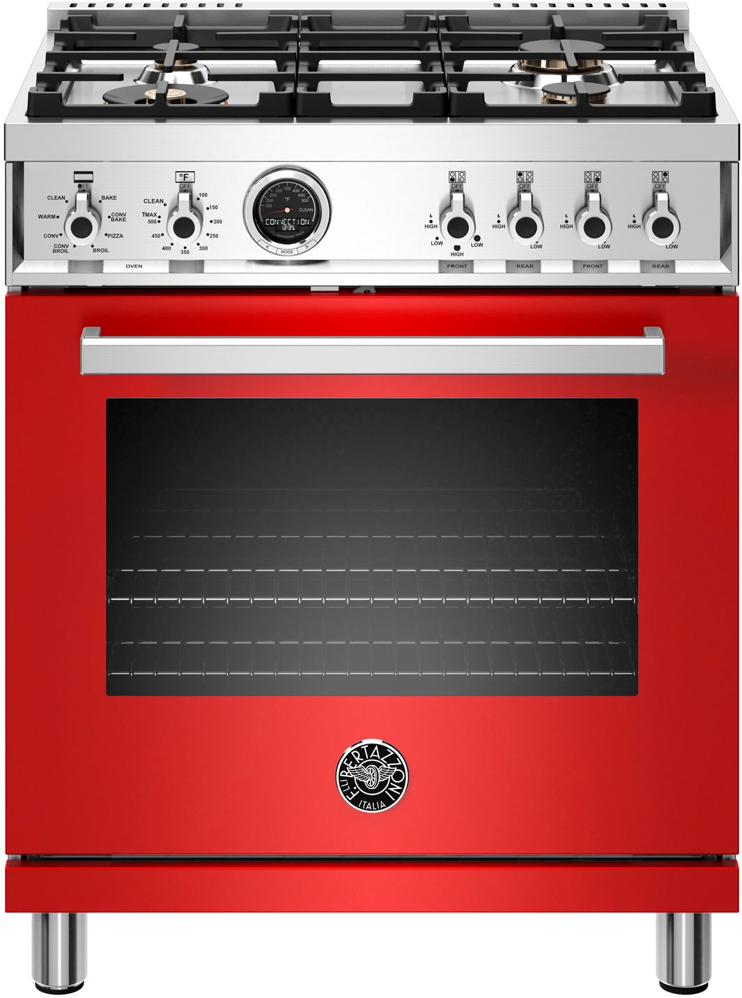 The new Bertazzoni ranges are superb cooking appliances designed, engineered and made in Italy. All Bertazzoni appliances integrate seamlessly into style-harmonized suites for a true, high-performing kitchen. The high-efficiency maintop with 4 brass burners features a dual ring 19,000 BTU power-burner that boils water in under 6 minutes (best in class), and 3 additional MonoBloc burners of variable size and power to suit every style of cooking, with delicate simmer at 750 BTUs. The 4.6 cubic feet oven cavity is the largest in its class, with dual convection fan for balanced airflow and even temperature baking and roasting on 7 shelf levels. The elegant digital temperature gauge monitors the actual temperature in the oven and has integrated controls in the bezel for the food temperature probe. The extra wide electric broiler with optional convection is ideal for grilling and searing at high heat. The oven includes convenient features such as smooth telescopic glides for the oven shelves and soft-close doors. The edge-to-edge interior oven glass door maximizes interior volume and can be wiped clean without effort. All Bertazzoni appliances are covered by a 2-year warranty. Products and packaging are 99% recyclable.