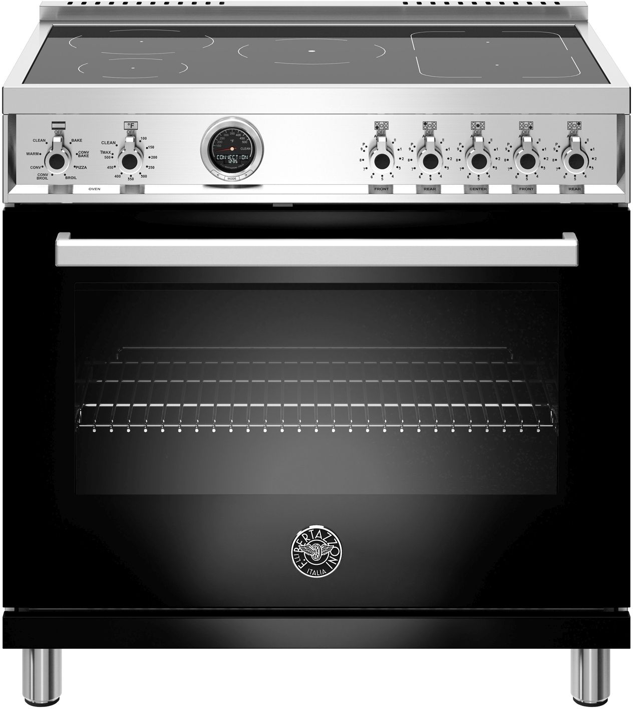 The new Bertazzoni ranges are superb cooking appliances designed, engineered and made in Italy. All Bertazzoni appliances integrate seamlessly into style-harmonized suites for a true, high-performing kitchen. This all-new induction range has 5 high-power heating zones with maximum power output of 3700W. The right-side heating zones can be bridged to create a larger cooking area. Each induction area is controlled with knobs and has a convenient read-out interface on the glass worktop. The 5.7 cubic feet self-cleaning oven is the largest in its class, with dual convection fan for balanced airflow and even temperature baking and roasting on 7 shelf levels. The elegant digital temperature gauge monitors the actual temperature in the oven and has integrated controls in the bezel for the food temperature probe. The extra wide electric broiler with optional convection is ideal for grilling and searing at high heat. The oven includes convenient features such as smooth telescopic glides for the oven shelves and soft-close doors. The edge-to-edge interior oven glass door maximizes interior volume and can be wiped clean without effort. All Bertazzoni appliances are covered by a 2-year warranty. Products and packaging are 99% recyclable.