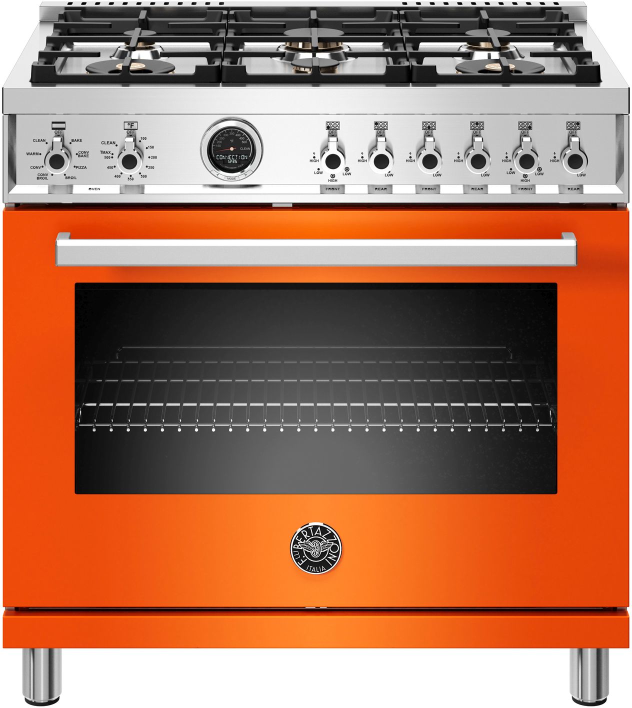 The new Bertazzoni ranges are superb cooking appliances designed, engineered and made in Italy. All Bertazzoni appliances integrate seamlessly into style-harmonized suites for a true, high-performing kitchen. The high-efficiency maintop with 6 brass burners features 2 dual ring 19,000 BTU power-burners that boil water in under 6 minutes (best in class), and 4 additional MonoBloc burners of variable size and power to suit every style of cooking, with delicate simmer at 750 BTUs. The 5.7 cubic feet self-cleaning oven is the largest in its class, with dual convection fan for balanced airflow and even temperature baking and roasting on 7 shelf levels. The elegant digital temperature gauge monitors the actual temperature in the oven and has integrated controls in the bezel for the food temperature probe. The extra wide electric broiler with optional convection is ideal for grilling and searing at high heat. The oven includes convenient features such as smooth telescopic glides for the oven shelves and soft-close doors. The edge-to-edge interior oven glass door maximizes interior volume and can be wiped clean without effort. All Bertazzoni appliances are covered by a 2-year warranty. Products and packaging are 99% recyclable.