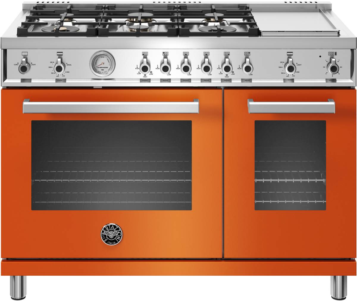 The new Bertazzoni ranges are superb cooking appliances designed, engineered and made in Italy. All Bertazzoni appliances integrate seamlessly into style-harmonized suites for a true, high-performing kitchen. The high-efficiency maintop with 6 brass burners and electric griddle features 2 dual ring 19,000 BTU power-burners that boil water in under 6 minutes (best in class), and 4 additional MonoBloc burners of variable size and power to suit every style of cooking, with delicate simmer at 750 BTUs. The stainless steel griddle with integrated cover provides additional cooking options. The 4.8 cubic feet main oven cavity is the largest in its class, with dual convection fan for balanced airflow and even temperature baking and roasting on 7 shelf levels. The elegant large temperature gauge monitors the actual temperature in the oven. The extra wide infrared gas broiler is ideal for grilling and searing at high heat. The 2.4 cubic feet auxiliary oven is perfect for smaller dishes and for warming. Both ovens include convenient features such as smooth telescopic glides for the oven shelves and soft-close doors. The edge-to-edge interior oven glass door maximizes interior volume and can be wiped clean without effort. All Bertazzoni appliances are covered by a 2-year warranty. Products and packaging are 99% recyclable.