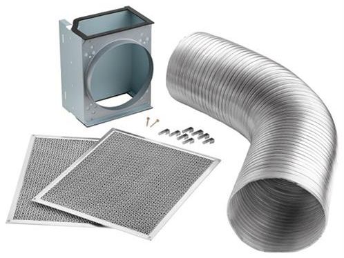 Kit includes 8" round metal flex duct, diverter and filters for 36” or 42” hood