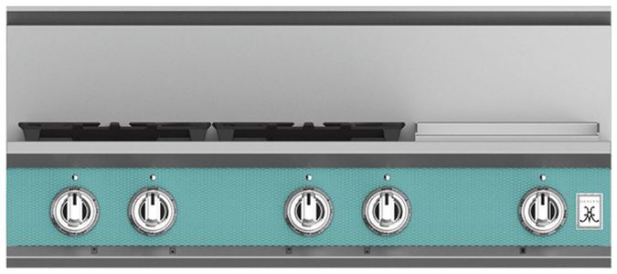 The 36” Hestan rangetop delivers searing culinary power with a sealed burner system delivering exceptional temperature control for culinary power up to 23,000 BTUs and as low as 500 BTUs. The 12” commercial-grade stainless steel gas griddle makes breakfast a cinch with superior heating and a thermostat for precise temperature control, while the continuous grates and backlit knobs combine stunning form and function.