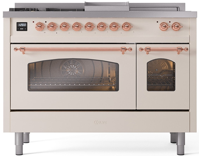 Introducing the new Nostalgie II 48" dual fuel range, a classic addition with a touch of innovation to any kitchen. This range feature sealed burners equipped with total black brass flame spreader that has a non-stick nanotechnological coating, heavy cast iron grates, 3.5 + 1.52 cu. ft. total double oven capacity and soft closing door system.Read More