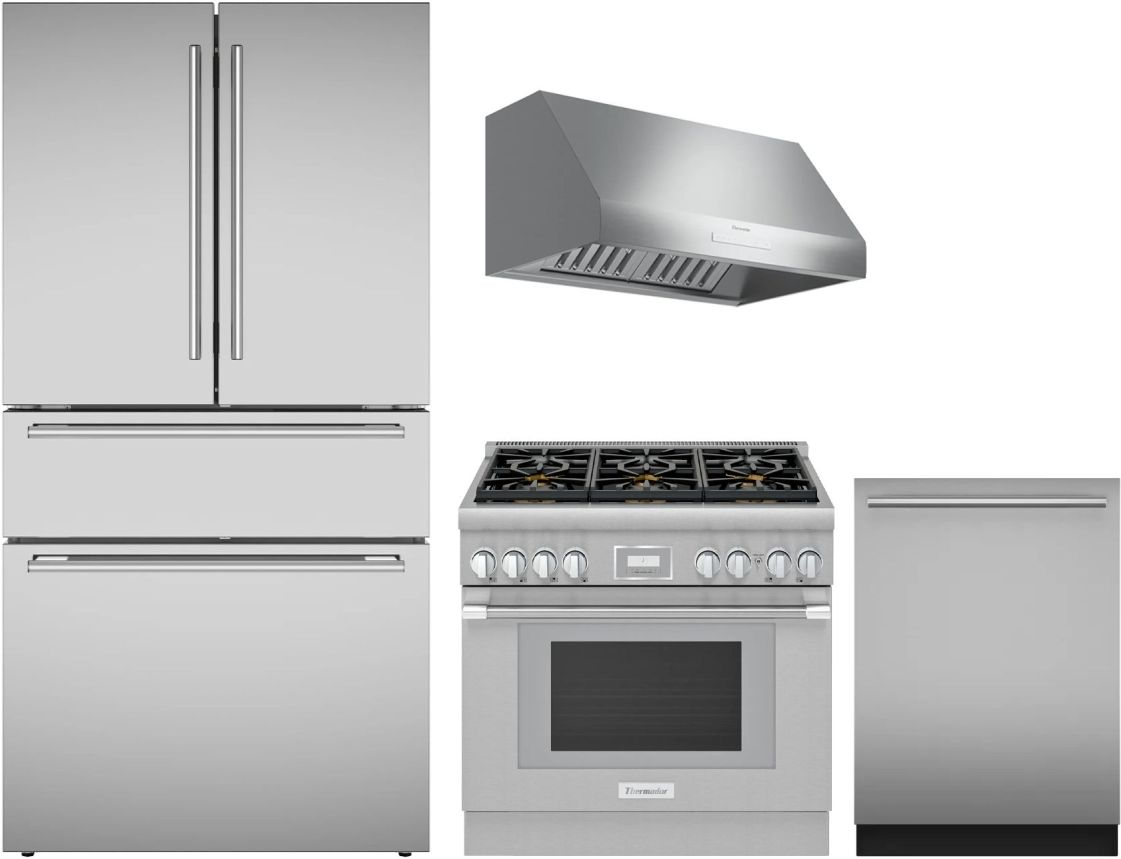 Thermador® 4 Piece Stainless Steel Kitchen Package with a French door refrigerator, slide in natural gas range, under cabinet range hood, and built in dishwasher.Read More