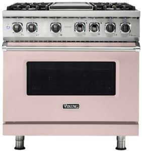 The Viking® Blush 36" Self-Cleaning Dual Fuel Range with Griddle combines luxury and performance. Featuring a spacious gas cooktop, an self-cleaning oven, and a built-in griddle, it offers precise cooking control and a stylish antique bronze finish for any kitchen.Read More