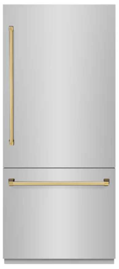 Luxury isn’t meant to be desired - it’s meant to be attainable. The ZLINE Autograph Edition 36 in. 19.8 cu. ft. Built-In Bottom Freezer Refrigerator with Water Dispenser and Ice Maker in Stainless Steel with Graphite Gray Interior and Polished Gold Accents (GRBITZ-304-36G) provides the ultimate upgrade to the center of your home by pairing premium dual cooling technology with enhanced storage capacity for multiple grocery items. Achieve ZLINE Attainable Luxury® excellence with innovative features designed to enhance your kitchen’s cooling and freezing capability.Read More